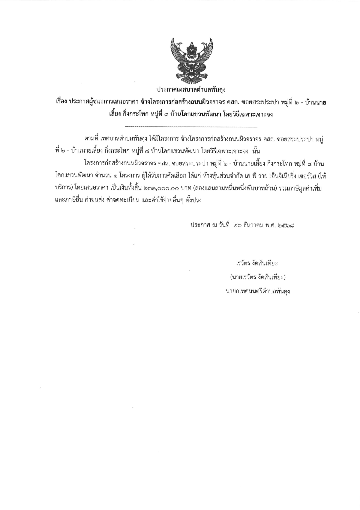 ประกาศผู้ชนะการเสนอราคา จ้างโครงการก่อสร้างถนนผิวจราจร คสล.ซอยสระประปา หมู่ที่ 2 -บ้านนายเลี้ยง กิ่งกระโทก หมู่ที่ 8 บ้านโคกแขวนพัฒนา โดยวิธีเฉพาะเจาะจง