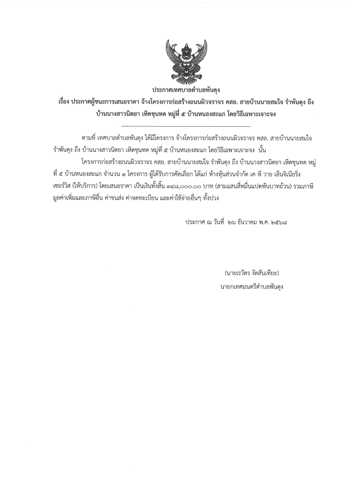 ประกาศผู้ชนะการเสนอราคา จ้างโครงการก่อสร้างถนนผิวจราจร คสล. สายบ้านนายสมใจ รำพันดุง ถึงบ้านนางสาวนิตยา เหิดขุนทด หมู่ที่ 5 บ้านหนองสะแก โดยวิธีเฉพาะเจาะจง