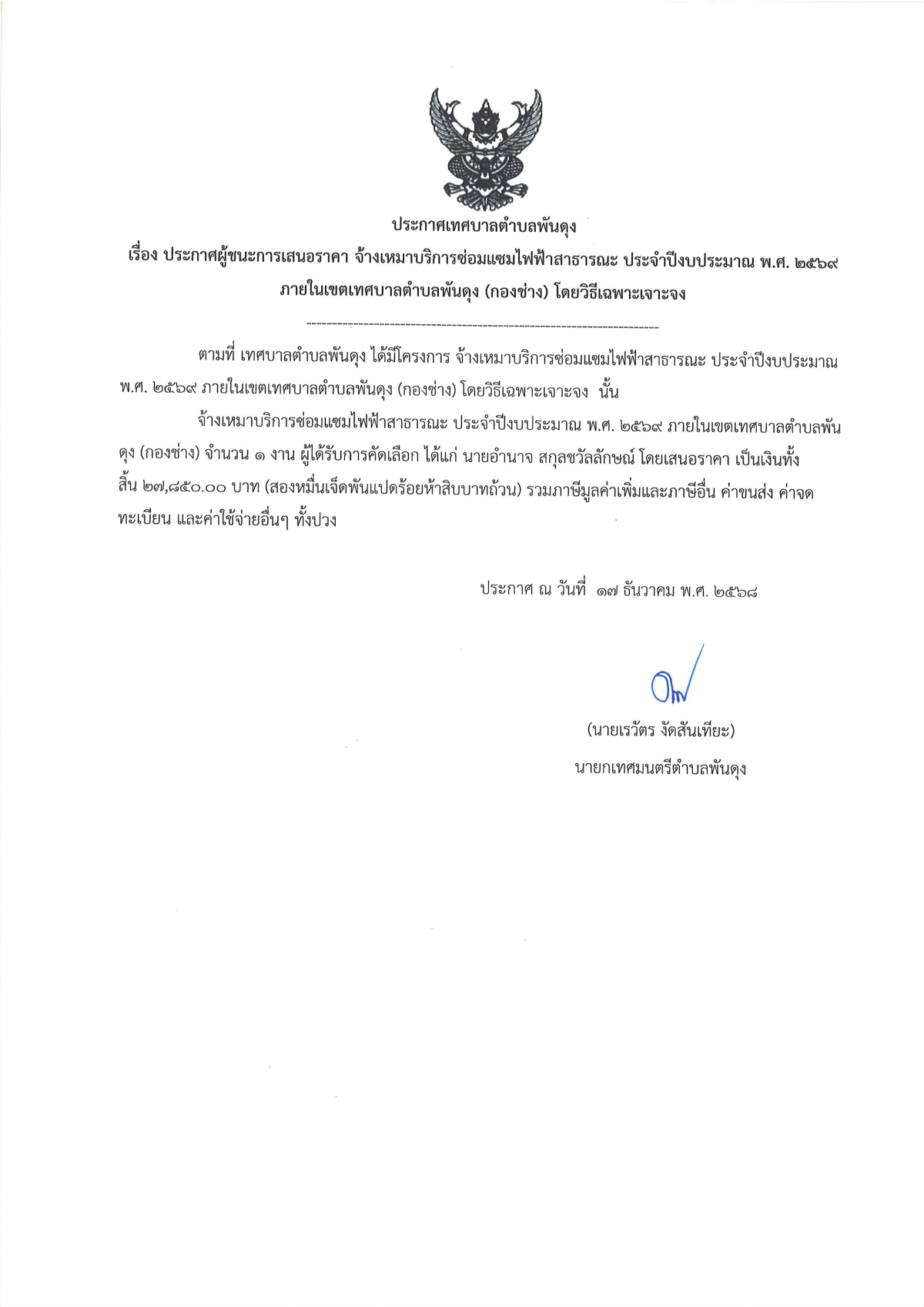 ประกาศผูู้ชนะการเสนอราคา จ้างเหมาบริการซ่อมแซมไฟฟ้าสาธารณะ ประจำปีงบประมาณ พ.ศ. 2569 ภายในเขตเทศบาลตำบลพันดุง (กองช่าง) โดยวิธีเฉพาะเจาะจง