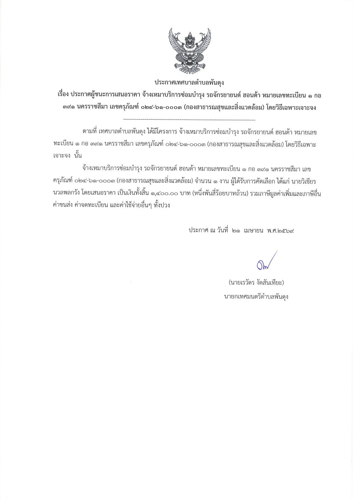 ประกาศผู้ชนะการเสนอราคาจ้างเหมาบริการซ่อมบำรุงรถจักรยานยนต์ ฮอนด้า หมายเลขทะเบียน 1 กอ 391 นครราชสีมา หมายเลขครุภัณฑ์ 024-61-0003 กองสาธารณสุขและสิ่งแวดล้อม เทศบาลตำบลพันดุง โดยวิธีเฉพาะเจาะจง