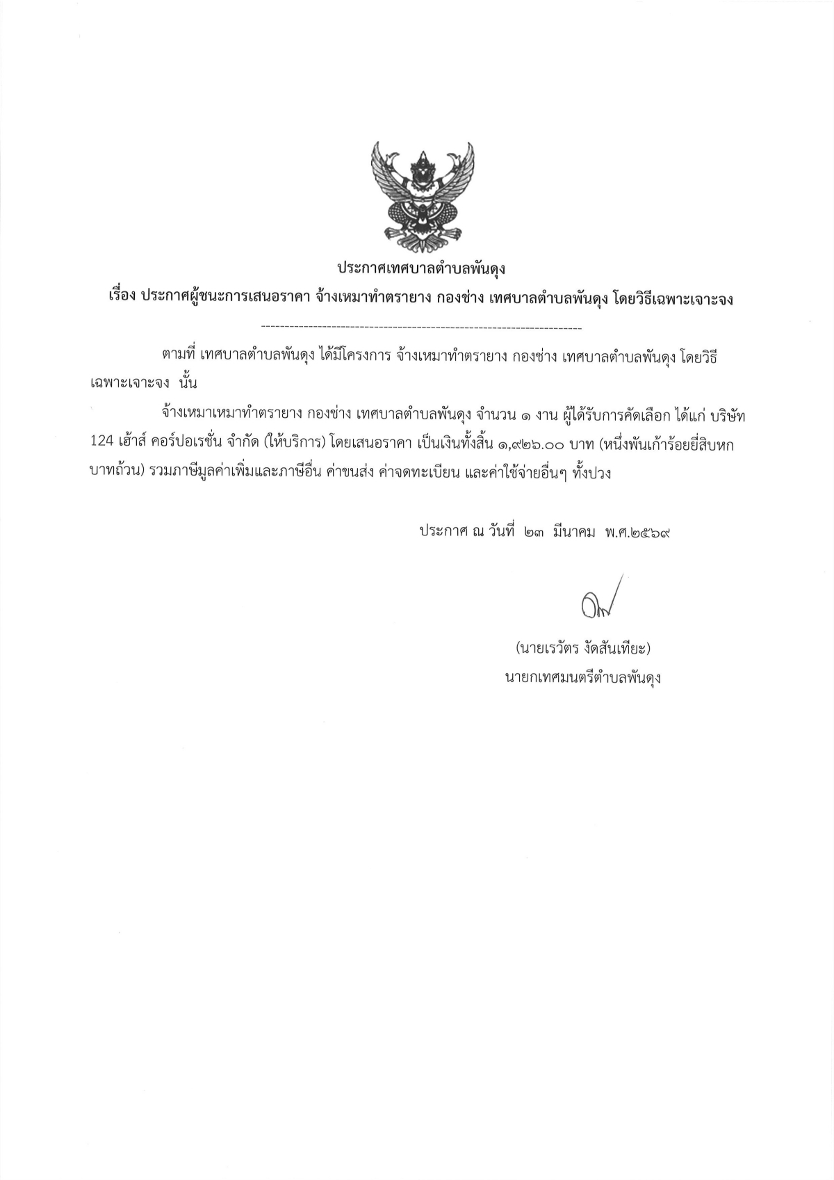 ประกาศผู้ชนะการเสนอราคา จ้างเหมาทำตรายาง กองช่าง เทศบาลตำบลพันดุง โดยวิธีเฉพาะเจาะจง