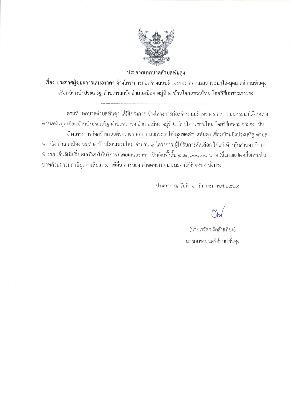ประกาศผู้ชนะการเสนอราคา จ้างโครงการก่อสร้างถนนผิวจราจร คสล.ถนนสระนาใต้ – สุดเขตตำบลพันดุงเชื่อมบ้านบึงประเสริฐ ตำบลพลกรัง อำเภอเมือง หมู่ที่ 2 บ้านโคกแขวนใหม่ โดยวิธีเฉพาะเจาะจง