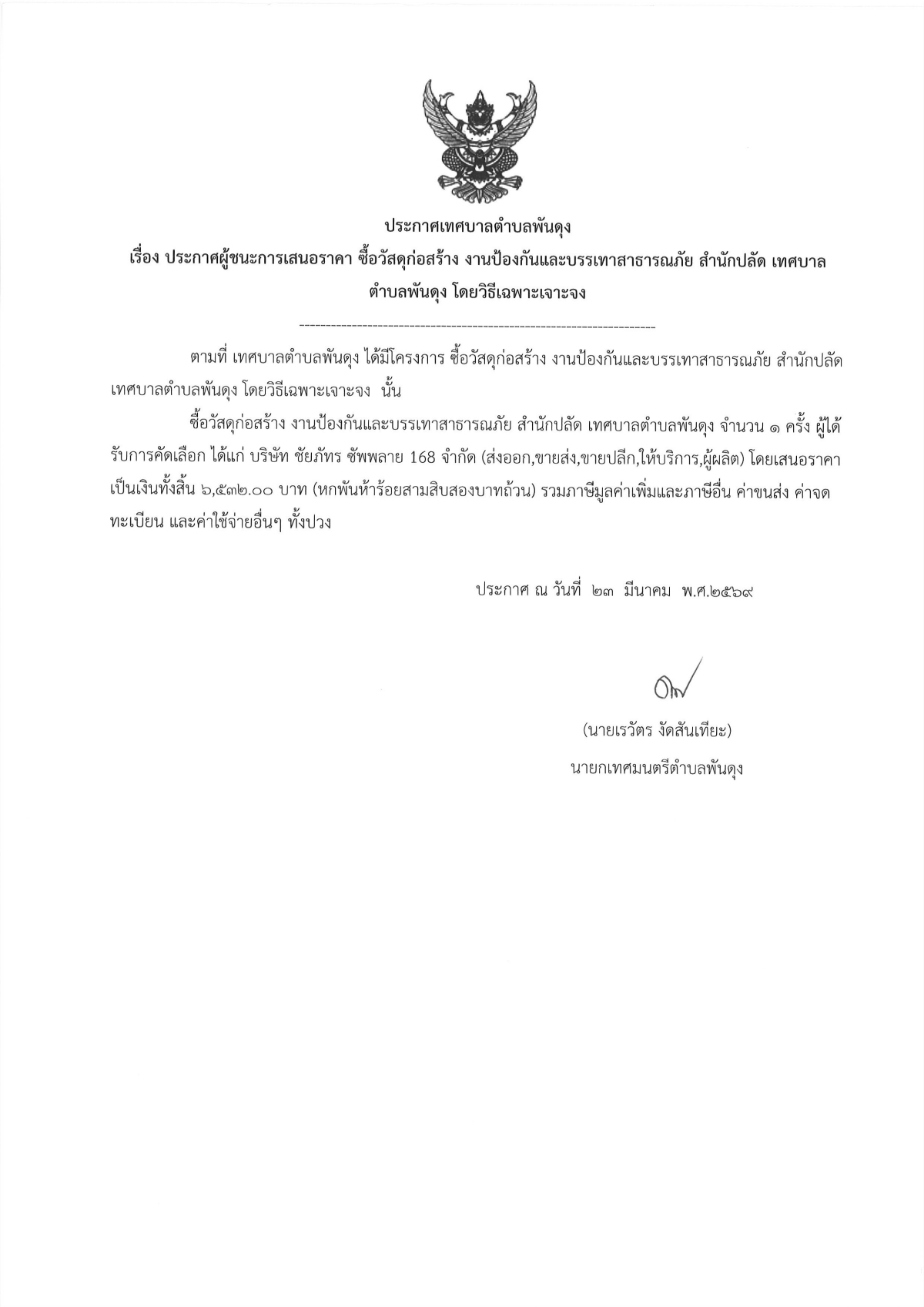 ประกาศผู้ชนะการเสนอราคา ซื้อวัสดุก่อสร้าง งานป้องกันและบรรเทาสาธารณภัย สำนักปลัด เทศบาลตำบลพันดุง โดยวิธีเฉพาะเจาะจง