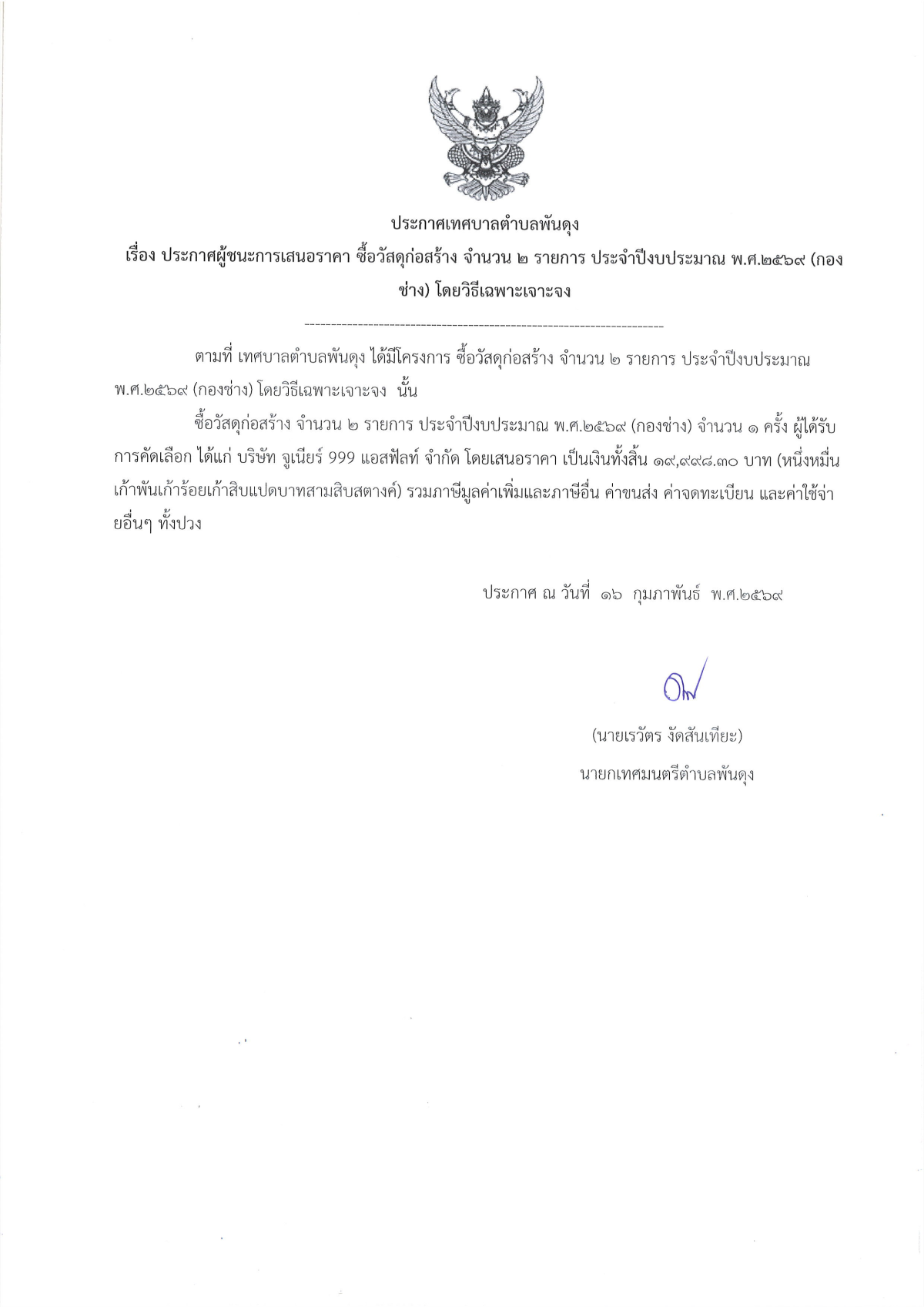 ประกาศผู้ชนะการเสนอราคา ซื้อวัสดุก่อสร้าง จำนวน ๒ รายการ ประจำปีงบประมาณ พ.ศ.๒๕๖๙ (กองช่าง) โดยวิธีเฉพาะเจาะจง