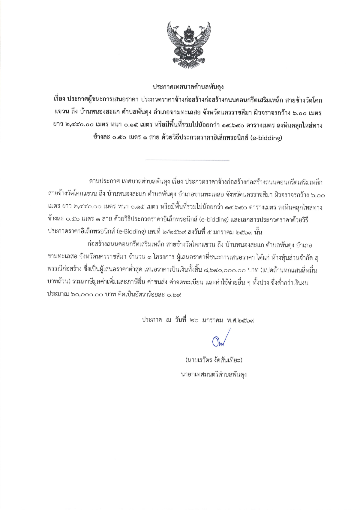 ประกาศผู้ชนะการเสนอราคา ประกวดราคาจ้างก่อสร้างก่อสร้างถนนคอนกรีตเสริมเหล็ก สายข้างวัดโคกแขวน ถึงบ้านหนองสะแก ตำบลพันดุง อำเภอขามทะเลสอ จังหวัดนครราชสีมา ผิวจราจรกว้าง 6.00 เมตร ยาว 2,440.00 เมตร หนา 0.15 เมตร หรือมีพื้นที่รวมไม่น้อยกว่า 14,640 ตารางเมตร ลงหินคลุกไหล่ทางข้างละ 0.50 เมตร 1 สาย ด้วยวิธีประกวดราคาอิเล็กทรอนิกส์ (e-bidding)