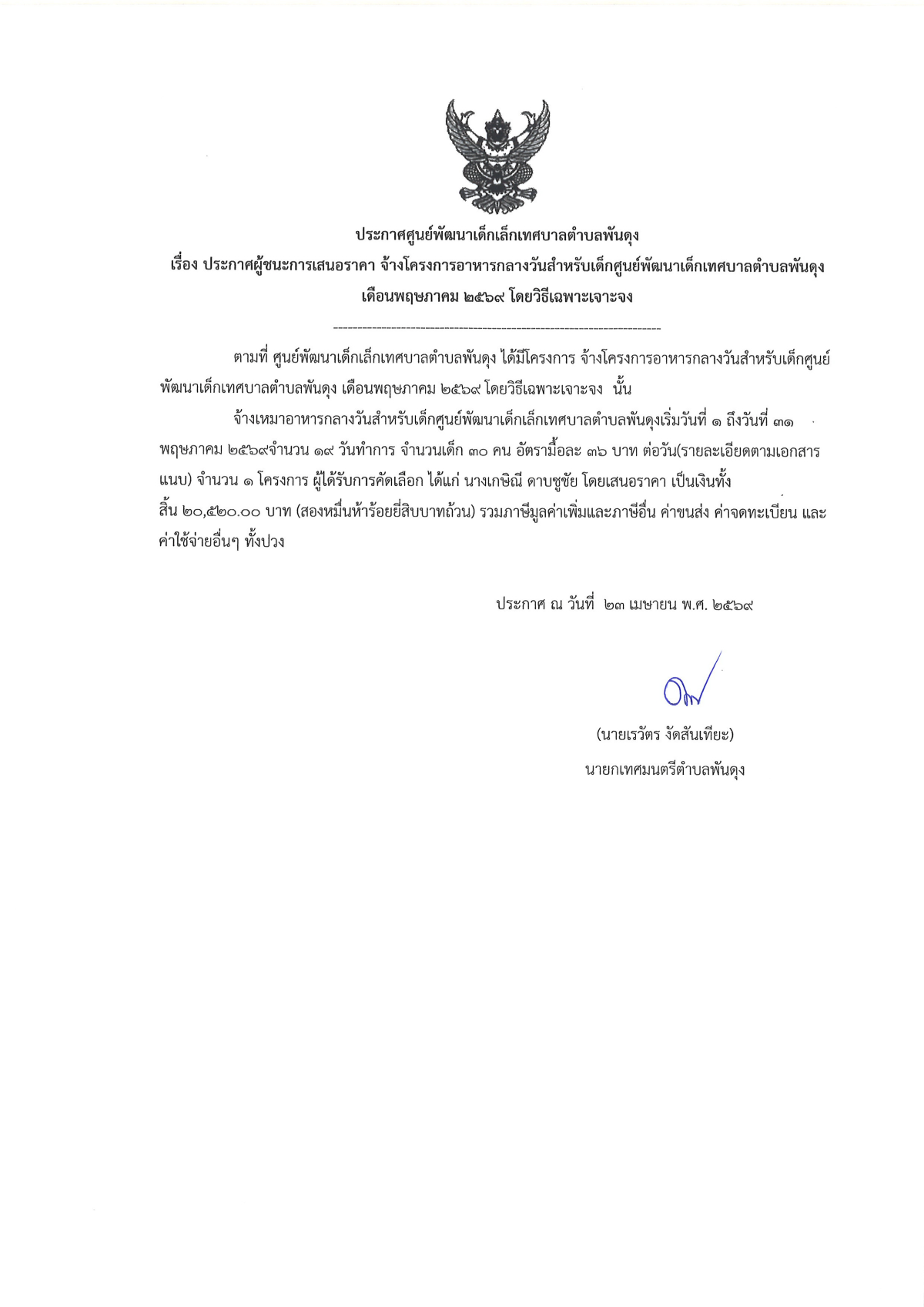 ประกาศผู้ชนะการเสนอราคา โครงการอาหารกลางวันสำหรับเด็กศูนย์พัฒนาเด็กเทศบาลตำบลพันดุง เดือนพฤษภาคม 2569 โดยวิธีเฉพาะเจาะจง