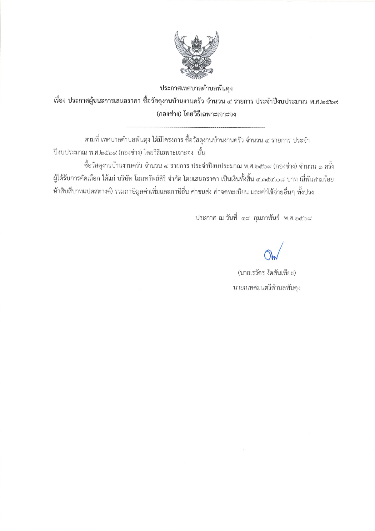 ประกาศผู้ชนะการเสนอราคา ซื้อวัสดุงานบ้านงานครัว จำนวน ๔ รายการ ประจำปีงบประมาณ พ.ศ.๒๕๖๙ (กองช่าง) โดยวิธีเฉพาะเจาะจง