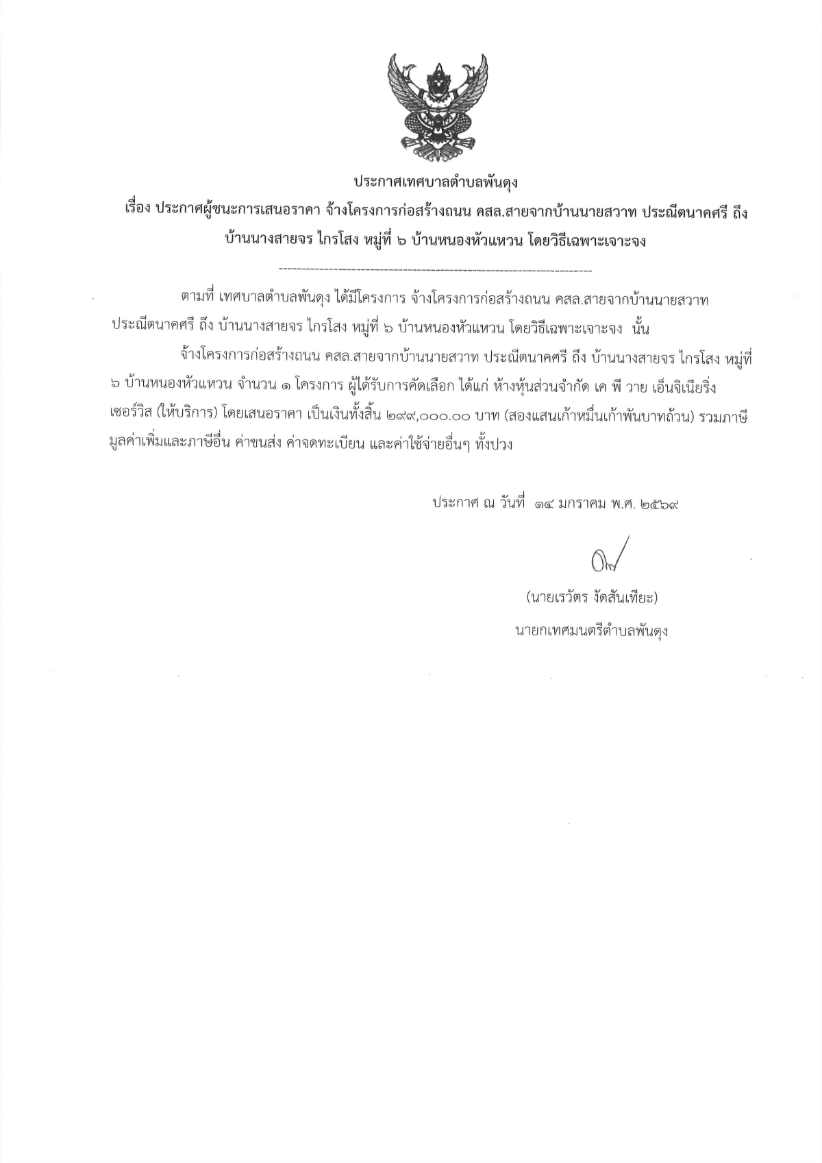 ประกาศผูู้ชนะการเสนอราคา จ้างโครงการก่อสร้างถนน คสล. สายจากบ้านนายสวาท ประณีตนาคศรีถึงบ้านนางสายจร ไกรโสง หมู่ที่ 6 บ้านหนองหัวแหวน โดยวิธีเฉพาะเจาะจง