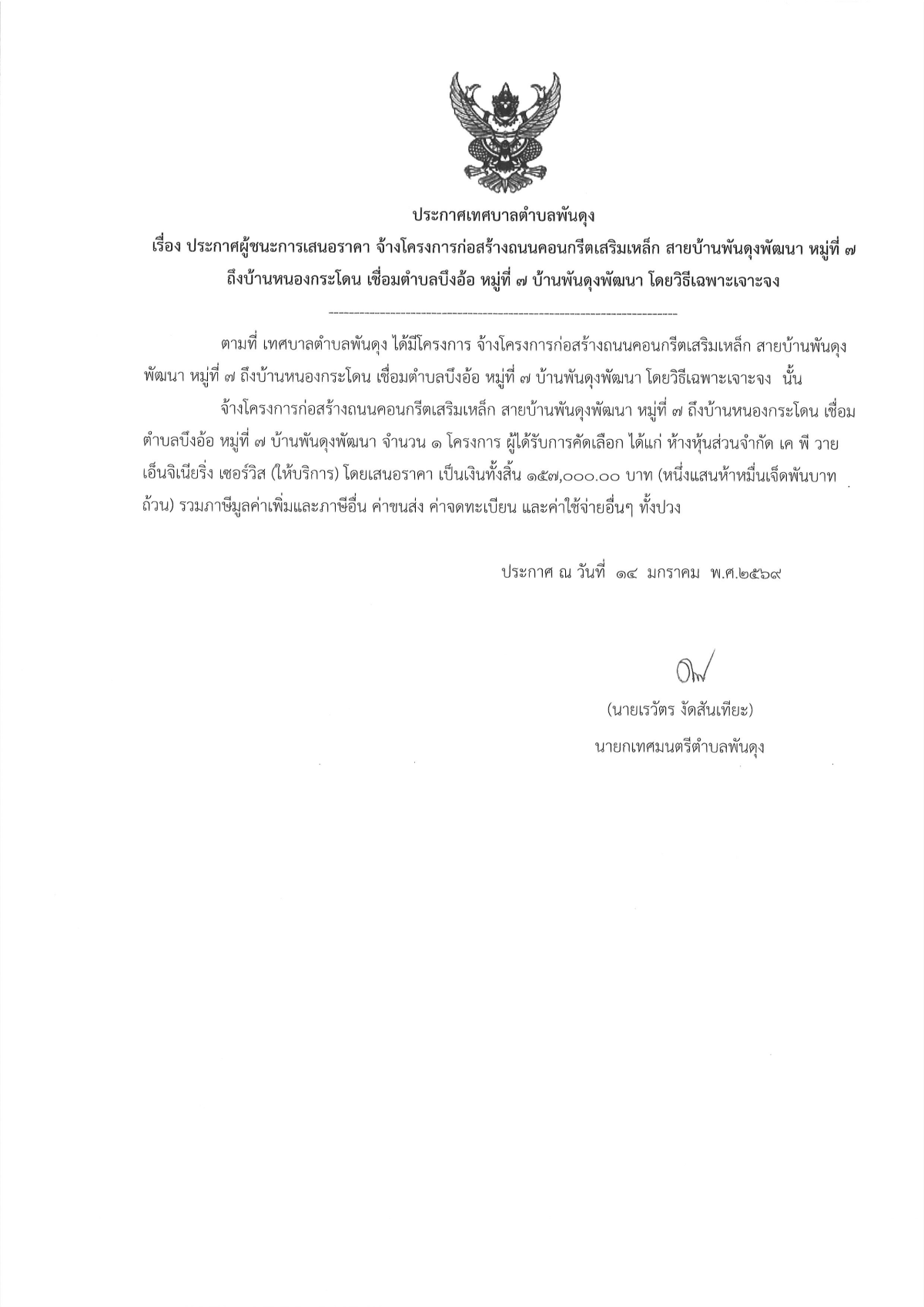 ประกาศผูู้ชนะการเสนอราคา จ้างโครงการก่อสร้างถนนคอนกรีตเสริมเหล็ก สายบ้านพันดุงพัฒนา หมู่ที่ 7 ถึงบ้านหนองกระโดนเชื่อมตำบลบึงอ้อ หมูที่ 7 บ้านพันดุงพัฒนา โดยวิธีเฉพาะเจาะจง